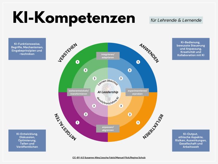 Laut dem KI-Kompetenzmodell für Lehrende und Lernende des Virtuellen Kompetenzzentrums: Künstliche Intelligenz und wissenschaftliches Arbeiten (VK:KIWA) umfasst KI-Kompetenz die Fähigkeit