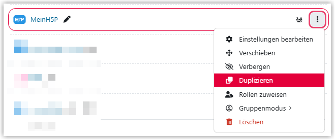 Wenn Sie auch das verlinkte H5P-Element duplizieren möchten, müssen Sie den Inhalt im Inhaltsspeicher duplizieren und bearbeiten und dann über die Aktivität H5P an der gewünschten Stelle im Kurs hinzufügen.